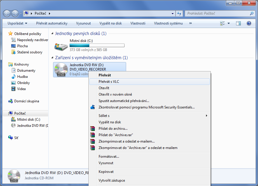 - Klikněte pravým tlačítkem na ikonu CD/DVD mechaniky a zvolte možnost: Přehrát s VLC, nebo Spustit automatické přehrávání.