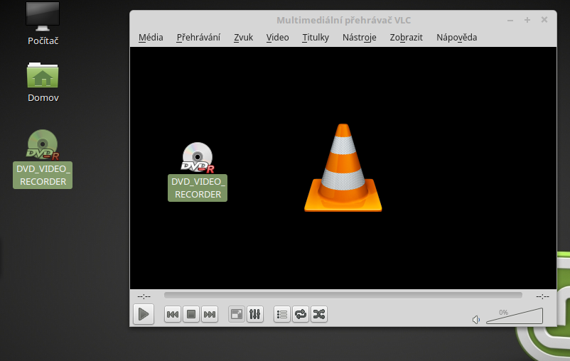 - Po vložení disku do mechaniky by se na Ploše měla objevit ikona disku, myší tuto ikonu přetáhněte do prostoru přehrávače VLC a upusťte.