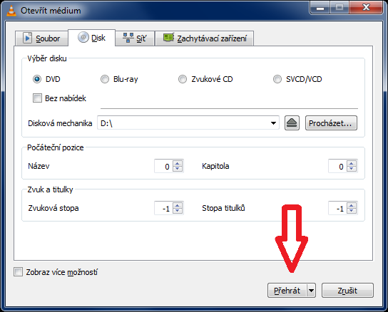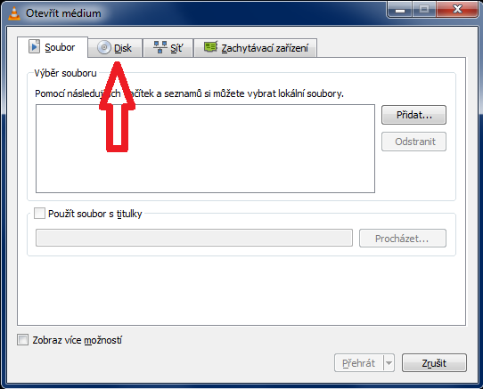 - V menu Otevřít médium, přepněte na kartu: Disk a klikněte na Přehrát